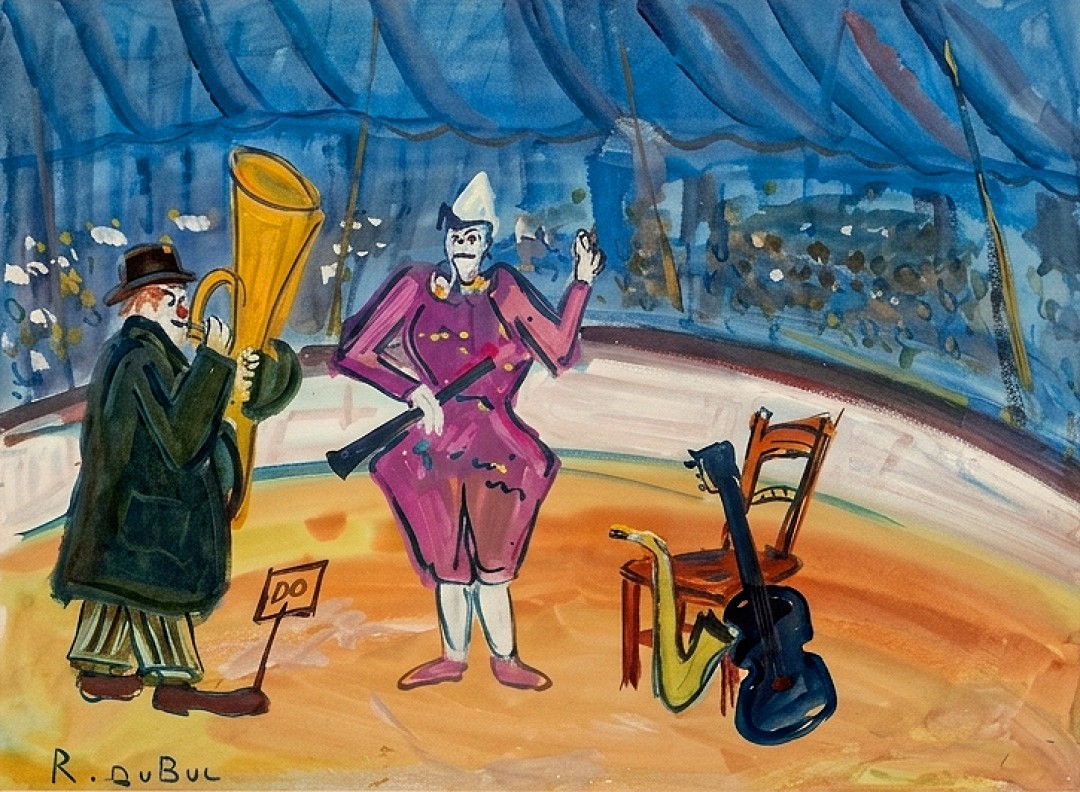 Roland Dubuc 2 clowns musiciens avec saxo et guitare Aquarelle sur papier Format : 65 x 45 Signé et daté en bas à gauche (Collection particulière)