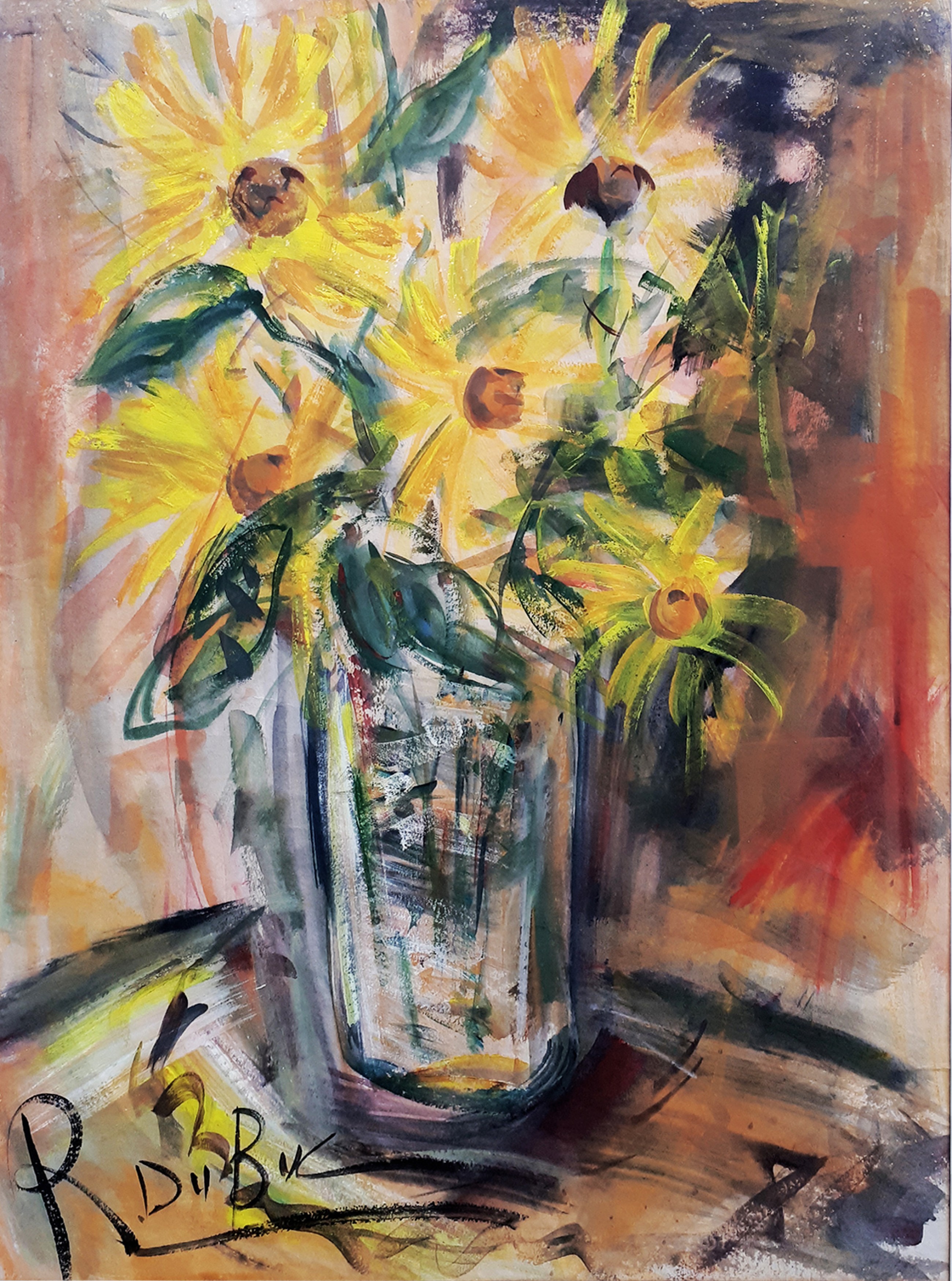 Roland Dubuc - Fleurs jaunes dans un vase Aquarelle et gouache sur papier 76 x 100 cm Signature en bas à gauche (Collection particulière)