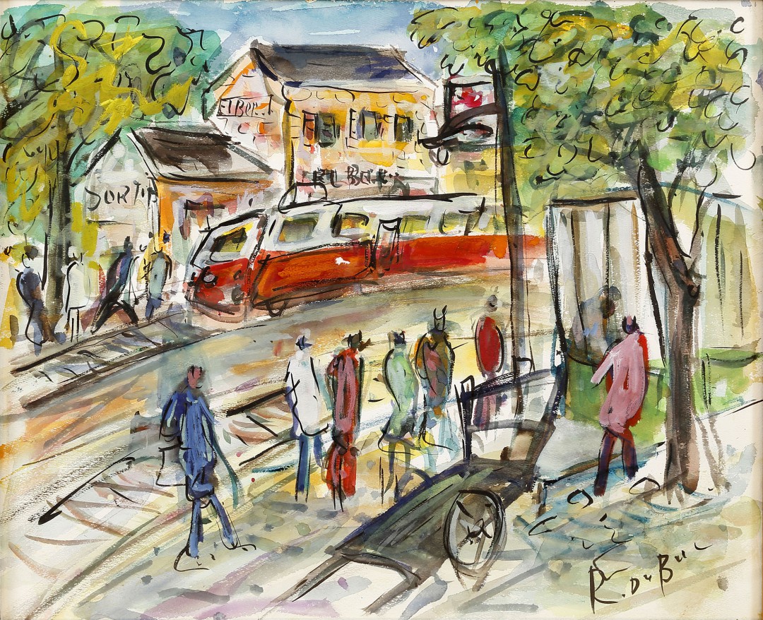 Roland Dubuc - Gare avec train Encre de chine, gouache et aquarelle Signature en bas à gauche (Collection particulière)