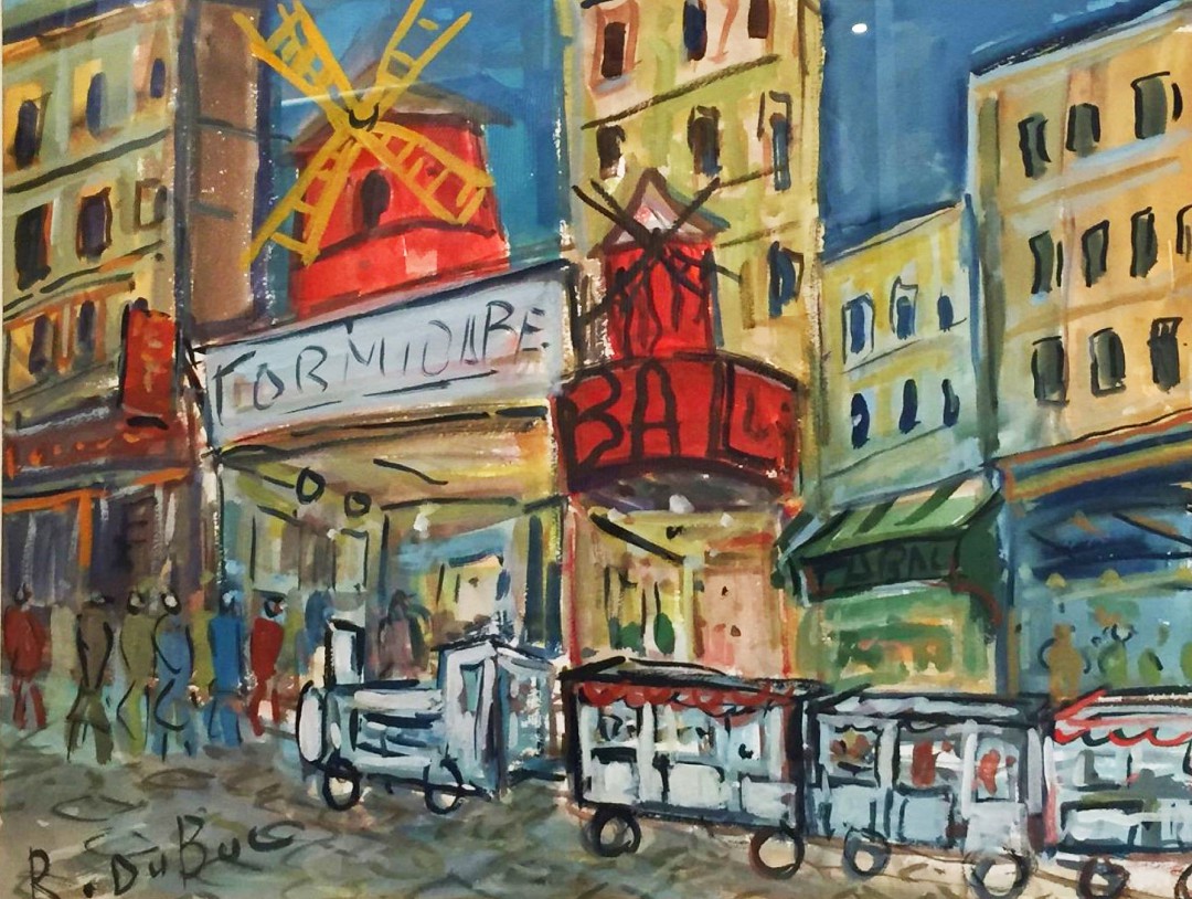 Roland Dubuc - Petit train devant le Moulin Rouge Aquarelle et gouache 52 x 42 cm Signature en bas à gauche (Collection particulière)